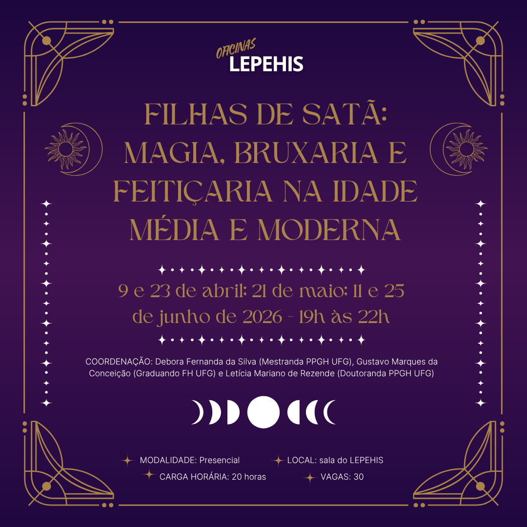 EMENTA: A oficina busca apresentar, de forma introdutória, o tema da bruxaria na Idade Média e Moderna como uma linha de pesquisa possível dentro das Humanidades. Por meio do contato com conceitos iniciais, fontes conhecidas e particularidades notáveis, objetivamos construir um ponto de partida sólido para todos que desejam investigar mais a fundo os assuntos correlatos desse fenômeno histórico. Ademais, por meio das reflexões de autores como José Pedro Paiva, em "Bruxaria e superstição num país sem “caça às bruxas”: 1600–1774"; James Sharpe, no capítulo “The Demonologists”, da obra "The Oxford History of Witchcraft and Magic"; Jeffrey Russell, no capítulo “Bruxaria na Grã-Bretanha e nas colônias inglesas da América do Norte”; e Laura de Mello e Souza, em "O Diabo e a Terra de Santa Cruz", analisar como os diferentes contextos históricos e geográficos produziram diferentes reações populares, inquisitoriais, legislativas e clericais ao fenômeno da bruxaria/feitiçaria/magia popular.